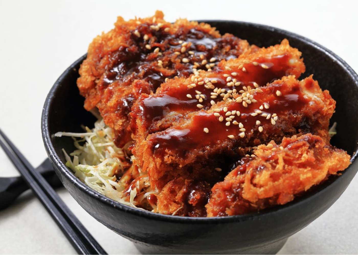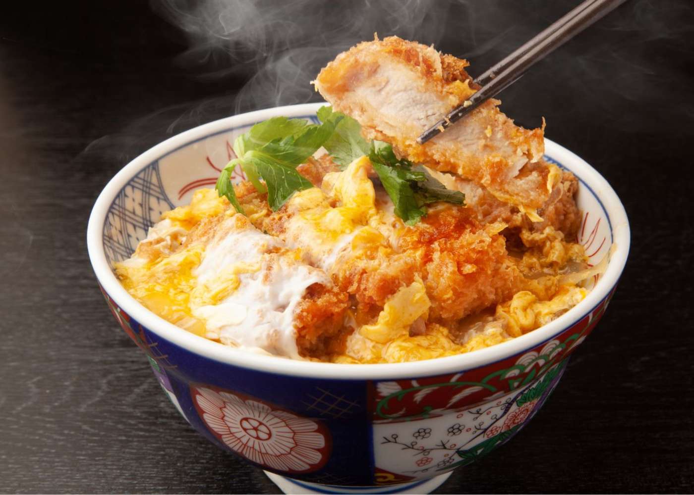 Tuck into a tasty Katsu-don (breaded pork cutlet fried with egg over rice).