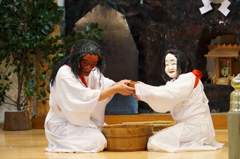 The four dances in the performance portray legendary episodes of Japanese mythology. In one, watch as dancers portraying Izanagi and Izanami, the husband and wife gods who created the Japanese islands according to Shinto legend, gracefully move around the space, expressing their happiness in marriage and blessings for bountiful harvests. A well-known dance depicts the tale of the sun goddess Amaterasu, infuriated at her brother, hiding herself away in a cave. This plunges the entire world into darkness, and a party of other gods work together to coax her out again. Local residents say that this very cave is located nearby in Takachiho, so be sure to visit it before or after the show as you explore the beauty of the gorge.