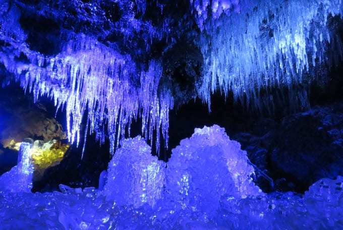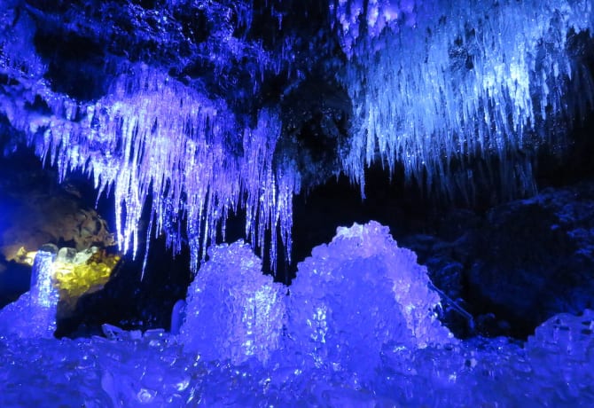 On the Lake Saiko side of Aokigahara, three caves have been equipped with pathways and stairs, allowing you to enter without requiring special equipment or guides. In addition to the large Saiko Bat Cave, the Narusawa Ice Cave and Fugaku Wind Cave are also worth a visit. From early winter to mid-spring, large pillars of ice freeze inside the Narusawa Ice Cave. Centuries ago, Fugaku Wind Cave was used to store ice for the region. A 15-minute walk away is the Fugaku Wind Cave, which boasts a similarly enchanting frozen pond.