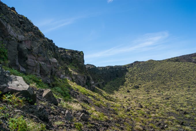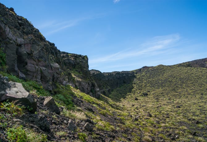 Take a closer look at the reddish-brown sediment in the caldera by following the summit trail—known as the Ohachi-meguri course—encircling the volcanic crater, which is about 300 meters in diameter.