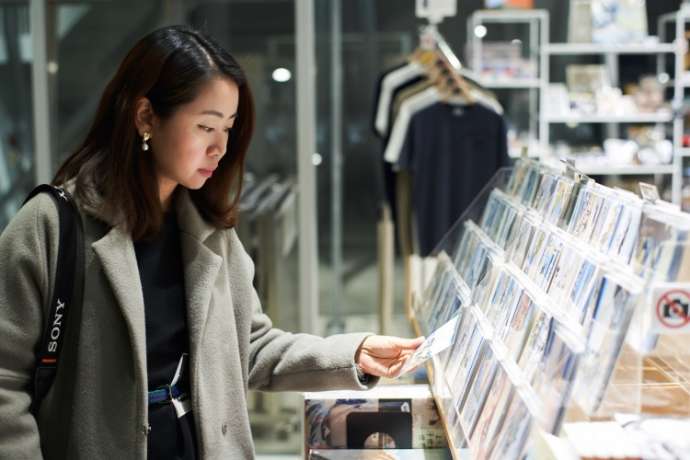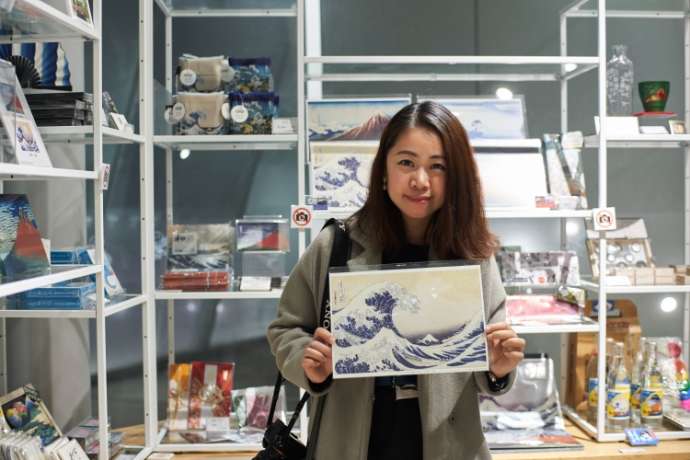 “This will be perfect to hang up at home,” says Yan as she picks out a large postcard of The Great Wave off Kanagawa.