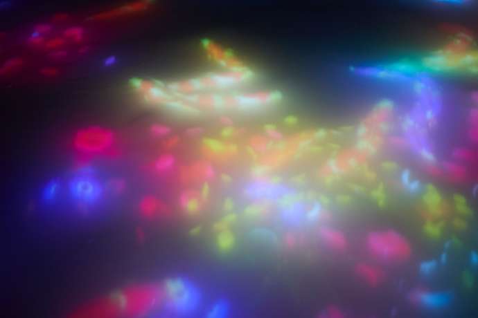 In the dark space, the surface of the water glows with a spectrum of glimmering light. Projected into the “water” are hundreds of koi fish that swim around your feet.