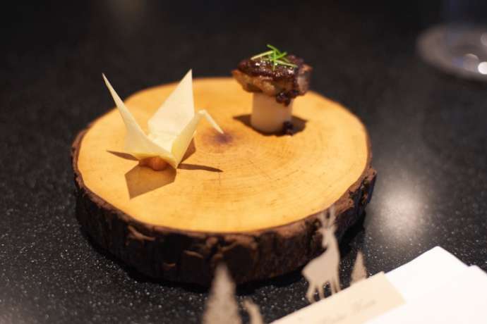 Yan: The origami crane made of thinly sliced celery root was so elegant that I felt bad eating it. The quince puree spread at the bottom of crane had a refreshing smell, the whole concept was very interesting.