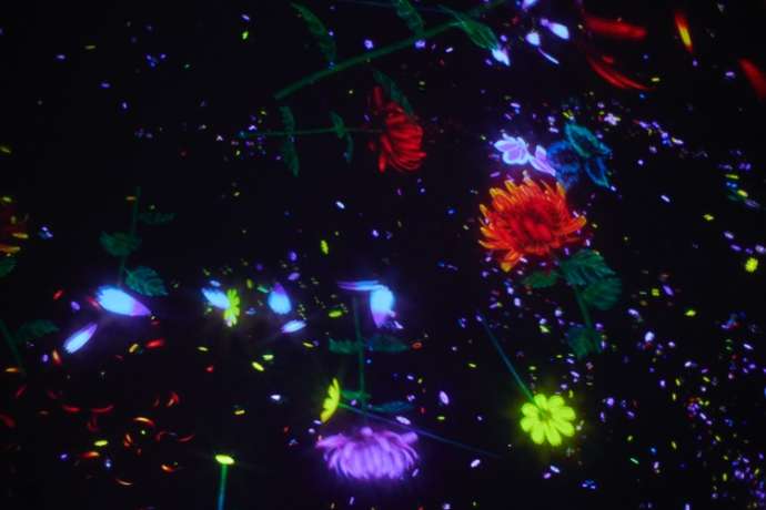 Floating in the Falling Universe of Flowers invites visitors to stand in a planetarium-like space and look up at colorful flowers suspended in the air as their petals fall and float gently down.