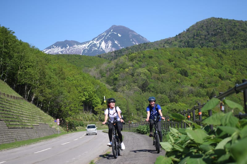 On the approximately two-hour, 22-kilometer Kamuiwakka Waterfall e-MTB tour, you’ll ride through a deep forest and reach the Kamuiwakka Falls. These waterfalls get warmer the higher up you go (around 25-40 degrees Celsius) thanks to underground water that has been heated by Mt. Io, an active volcano, running into the stream.