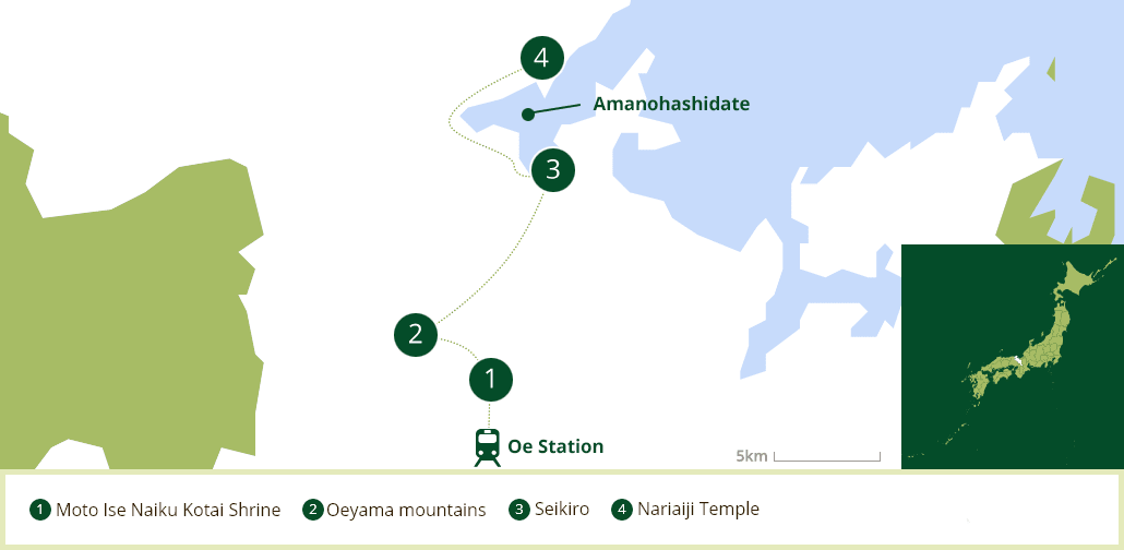 The final day of your trip has come. Having filled up on a delicious breakfast at Seikiro, start out on a walk from the castle town area of the Miyazu Kaido. As you walk among the atmospheric rows of pine trees on Amanohashidate , One of Japan’s Three Scenic Views, you’ll start the uphill journey to Nariaiji Temple.