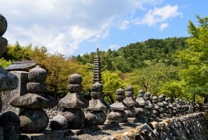 Adashino Nenbutsuji Temple is said to have been founded by the venerable monk Kukai around the 8th century. It is believed that the approximately 8,000 stone images and pagodas here commemorate the souls of those who died without kin. The area has been used as a place for funerary rites since ancient times, when bodies were left to the elements. Later, bodies came to be buried, and stone images were placed to honor the dead. Many of the images were scattered and buried throughout the area. In the middle of the Meiji era (1868-1912), locals and temple officials gathered the images in the temple precincts and lit candles to worship them. This is the beginning of the annual Sento-Kuyo ceremony.