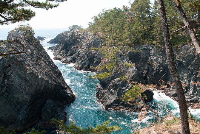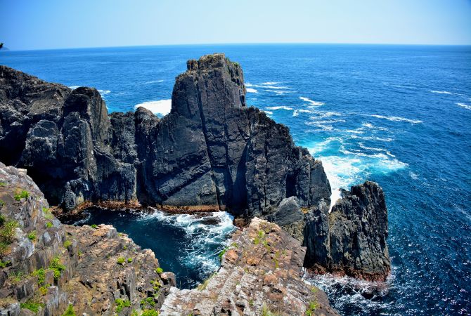 Along the Goishi Coast, there are several unique rock formations. The most famous of these is Anatoshi-iso, a rock formation that has three holes eroded in it. The rocks look like arches floating on the ocean.