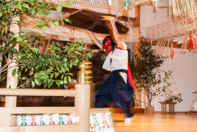 From the middle of November to early February every year in Kyushu's Miyazaki Prefecture , the Takachiho Evening Kagura is an all-night extravaganza of dancing, storytelling, drum beating, and masks, celebrating an 800-year-old tradition. It's a highly entertaining and enriching view of Japan's historical origins. Takachiho's version was designated one of Japan's Intangible Folk Cultural Properties.