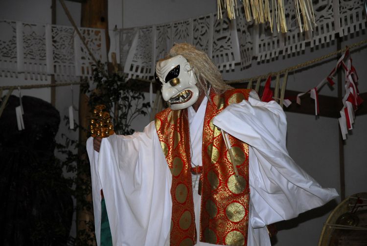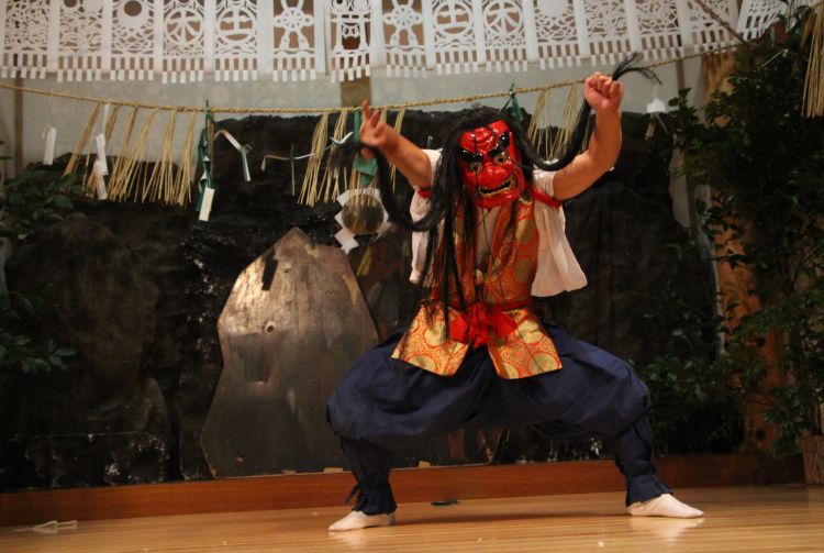 The 33 dances performed during the full festival represent different gods and myths and reenact the Japanese legend of how the sun goddess Amaterasu, who had hidden in a cave and plunged the world into darkness, was coaxed back out by the whole pantheon of deities.