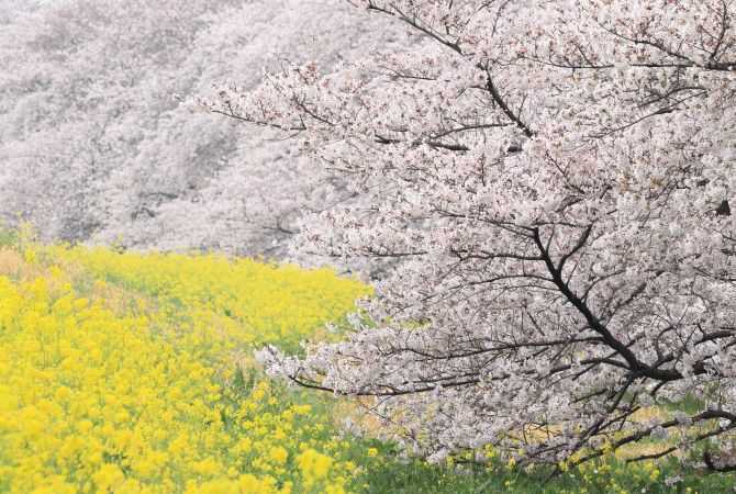 El área es especialmente bonita en primavera con los cerezos en flor. Las flores de los cerezos, de una suave tonalidad rosa, crean un bonito contraste con el amarillo intenso de las flores de colza que se abren por debajo.