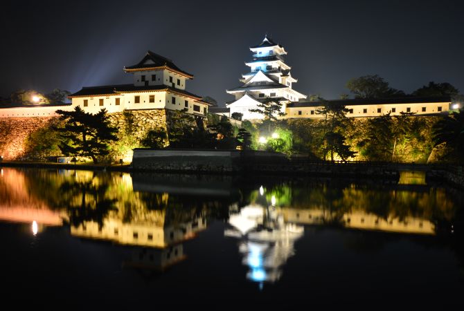 El castillo de Imabari tiene uno de los tres fosos de agua salada de Japón y, en ocasiones, puedes ver peces marinos nadando en su interior. Su interior tiene un aspecto más moderno, con muchas exposiciones que te llamarán la atención. El mejor momento para contemplar el castillo es cuando cae la noche, porque la espectacular iluminación saca a relucir los impresionantes detalles del exterior del castillo.