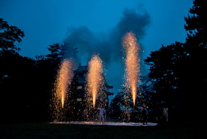 Durante el evento, cañones tezutsu de más de 450 años de antigüedad lanzan impresionantes chispas al aire, que caen en cascada como si fueran cataratas. También puedes aprender a bailar la «danza de la hierba de bambú», típica de la región.