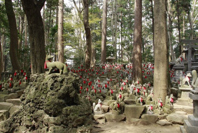 Toyokawa Inari es un templo budista que ha fusionado las prácticas sintoístas y budistas. Consagra a una deidad que va sobre los lomos de un zorro blanco, que porta una espiga de arroz junto con la deidad principal. Pasea por los extensos terrenos del santuario entre miles de estatuas de zorros de piedra que llevan delantales rojos.