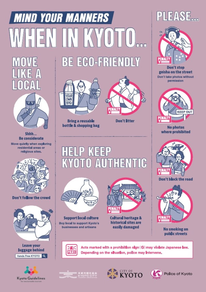Kioto lanza una campaña para promover el comportamiento respetuoso entre los visitantes. La ciudad de Kioto ha publicado recientemente una guía visual titulada "MIND YOUR MANNERS WHEN IN KYOTO...", destinada a informar a los visitantes sobre las costumbres y regulaciones locales para asegurar una experiencia más auténtica y respetuosa tanto para los turistas como para los residentes.