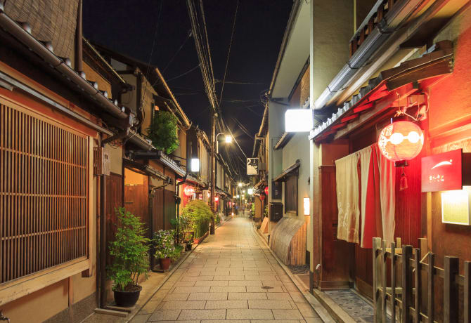 Gion alberga dos de los cinco distritos kagai o barrios de geishas. Después de la representación en Gion Corner, da un paseo por las calles de tenue iluminación; puede que tengas la suerte de ver a las artistas camino a su cita de cada noche.