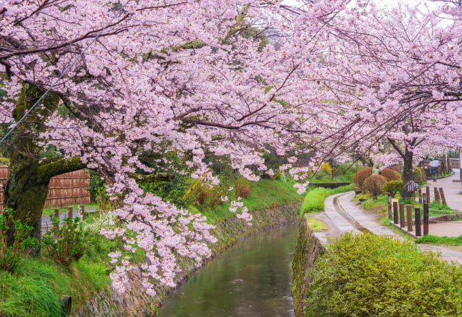 El Tetsugaku-no-michi o Camino de la Filosofía es una ruta muy agradable que bordea un canal rodeado de cerezos. Es especialmente popular por sus hermosas flores estacionales y los colores que tiñen las colinas de Higashiyama en otoño.