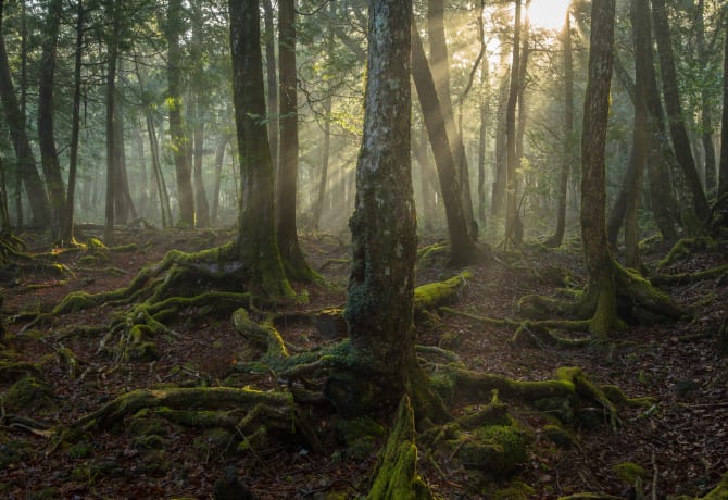 El extenso bosque Aokigahara , que se extiende a través de la falda noroeste de una montaña junto al lago Saiko, crece sobre una meseta de lava, con numerosos tsugas y cipreses de más de tres siglos de antigüedad. Este exuberante bosque está lleno de pequeños animales y muchas especies de aves. Hay varias rutas de senderismo y caminos que puedes tomar para explorar Aokigahara. Dada su increíble densidad, es fácil perderse en el bosque, así que asegúrate de seguir los senderos.