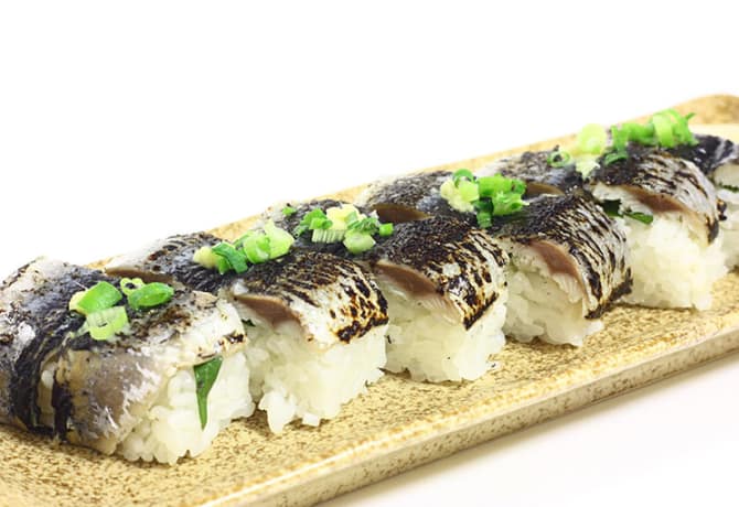 El oshizushi es un tipo de sushi a capas que se prepara en una prensa tradicional de madera. El pez sauri capturado en Ise tiene una carne magra y firme, perfecta para oshizushi.