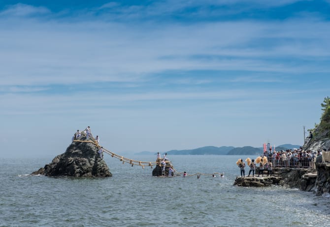 Ubicado a 700 metros mar adentro, Meoto Iwa sirve como puerta de entrada para ofrecer oraciones a Amaterasu Omikami. El sol naciente se puede ver entre estas rocas de mayo a julio, en otoño e invierno completa la estampa la luna llena.