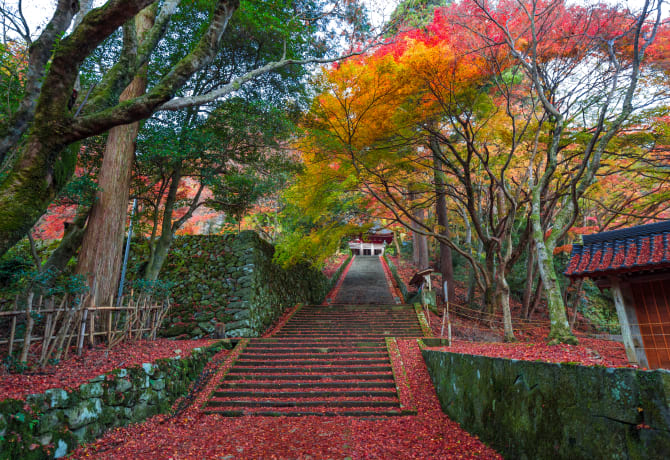 Situado en las verdes colinas sobre el santuario Izumo Taisha, el templo Gakuenji está envuelto en leyenda. Vaga por los terrenos y encuentra la cascada ante la cual se dice que entrenó Benkei, un temible guerrero. Su historia se transmite de generación en generación, y cada año, en noviembre, se celebra en su honor el festival del follaje de otoño del Templo Gakuenji. El otoño es una época del año especialmente bonita para visitarlo.