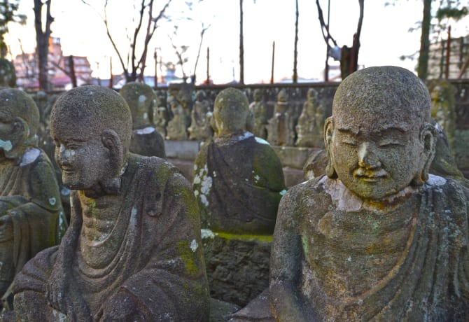 Merece la pena visitar el templo Kitain, donde podrás ver los restos de los edificios del palacio que antiguamente formaron parte del castillo de Edo y sus famosas esculturas de piedra de Gohyaku Rakan.