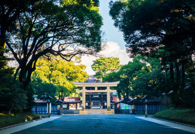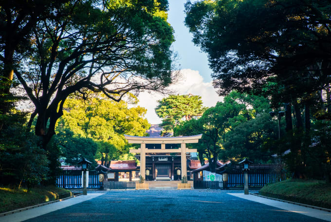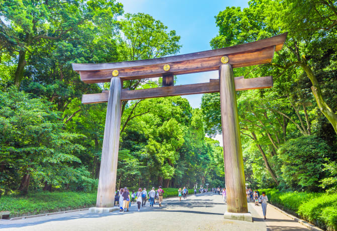 Meiji-jingu es uno de los santuarios más populares del país y se encuentra al otro lado del animado y colorido barrio de Harajuku . Está dedicado a las almas del emperador Meiji y la emperatriz Shoken, y se puede acceder a él por un largo sendero que atraviesa un tranquilo bosque, con árboles que fueron plantados hace más de 90 años tras la muerte del emperador en 1912. La zona está especialmente bonita en junio, cuando hay una explosión de colores como resultado de la floración de los iris y las hortensias.