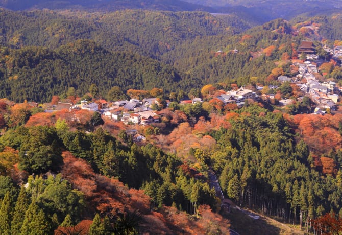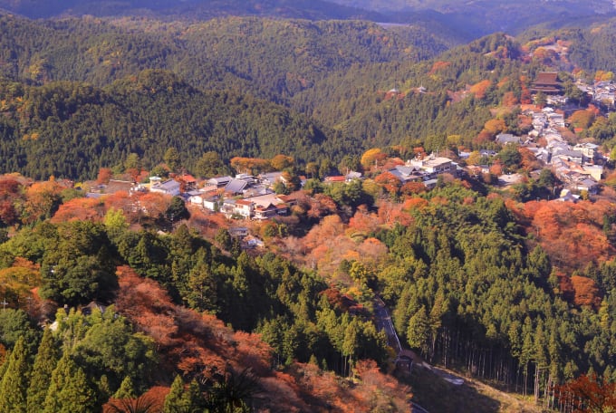 Este punto de observación recomendado fue en su día la sede de una corte en el exilio: la del emperador del siglo XIV, Go-Daigo, que libró una amarga batalla contra el clan guerrero Ashikaga sin éxito y tras la cual tuvo que huir al monte Yoshino . Aquí no hay ruinas, sino una pagoda perteneciente al templo Kinpusenji .
