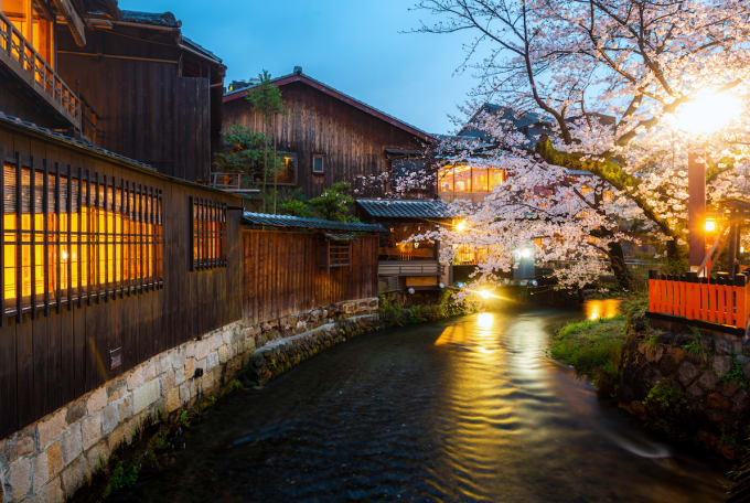 Gion es una zona que se recomienda visitar de noche, y es aún más especial en este tramo a lo largo del río Shirakawa. Al caminar esta calle podrás observar el interior de las exclusivas casas del té al otro lado, contemplar siluetas con kimono paseando por las calles adoquinadas y, por supuesto, admirar las flores tenuemente iluminadas. También es muy probable que veas geiko (geishas) a medida que avanza la noche.