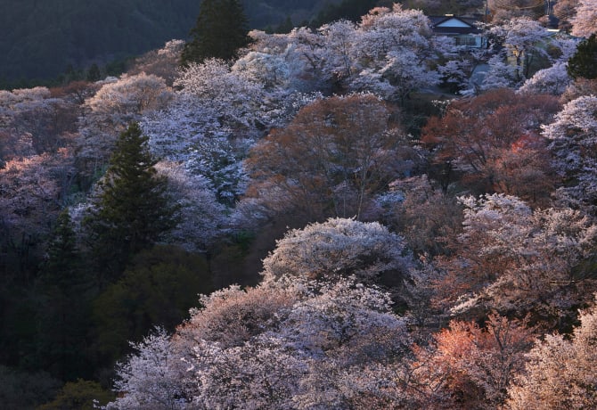El monte Yoshino , declarado Patrimonio Mundial por la UNESCO, forma parte de un extenso parque nacional en la prefectura de Nara . La zona se conoce como «Ichimoku ni senbon», que significa «el lujo de ver 1000 cerezos». Y, efectivamente, aquí hay unos 30 000. Este espectáculo se menciona constantemente en la literatura, la poesía y la música clásica japonesa, y sigue inspirando a los visitantes hasta la fecha.