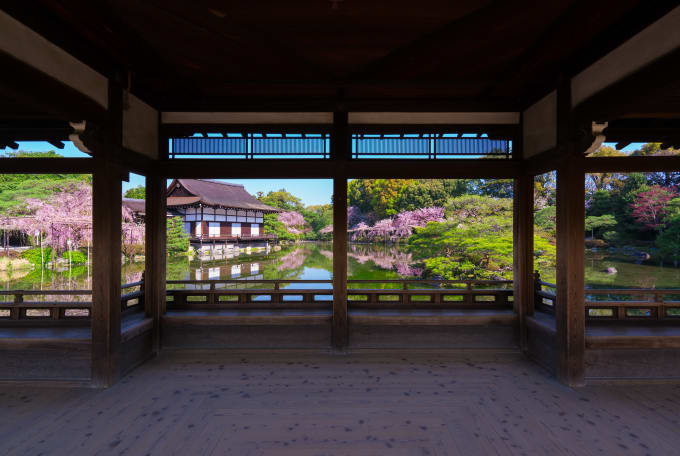 Al pasar por la gigantesca puerta torii, puede que te preguntes por qué el santuario Heian-jingu es tan distinto de otros santuarios de Kioto. El santuario se construyó en 1895 para asemejarse al templo Chodoin del siglo VIII, cuando Kioto era la capital, Heian-kyo. En primavera, es famoso por los cerezos llorones en flor que cuelgan sobre los pabellones del santuario, siendo un lugar popular para contemplar estos árboles en floración.