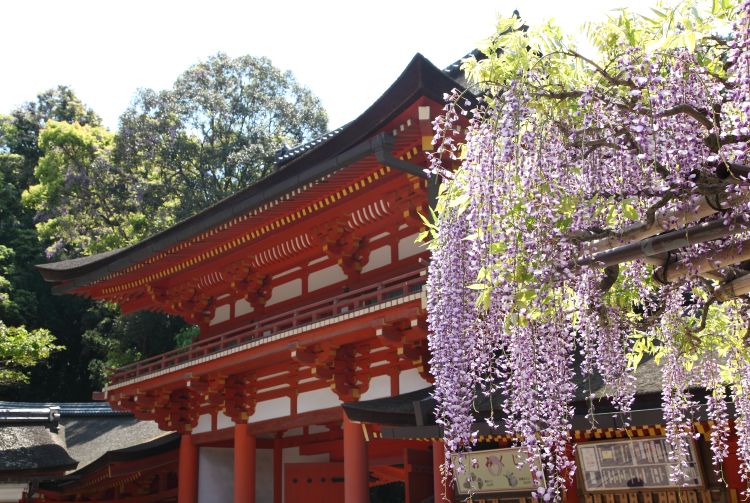 El santuario de Kasuga Taisha , en la prefectura de Nara , se llena de color en primavera. Es en esa época, a principios de mayo, cuando más de 200 árboles de glicina florecen en sus terrenos. Estas flores son el símbolo del santuario y las miko —o sirvientas del templo— las lucen en tocados adornados con sus pétalos violetas.