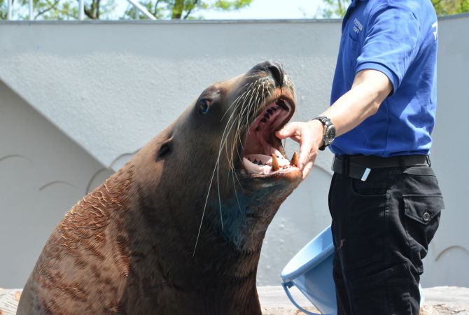 Disfruta de los espectáculos diarios de delfines, y escucha los comentarios durante la alimentación de los leones marinos de Steller y los pingüinos