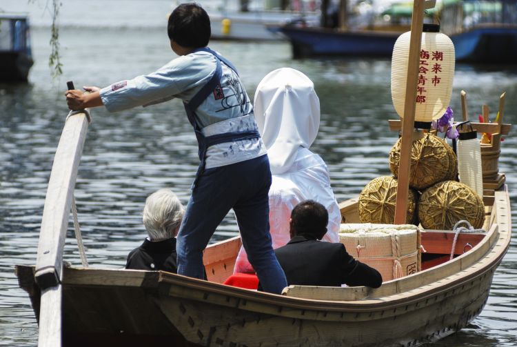 - Las mujeres vestidas de novias recorriendo los canales de la ciudad en una tradición conocida como yomeiri-bune