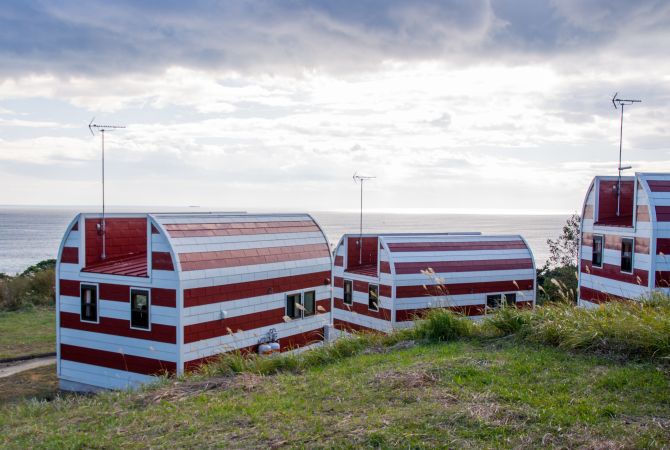 La Isla del Manga es una zona en el extremo opuesto del pueblo de Nitoda, con varios alojamientos artísticos inspirados en gatos. Para alojarse, hay que reservar con antelación pero cualquiera puede visitar la divertida arquitectura del campin. También puedes pasar la noche en uno de los minshuku, alojamientos al estilo casa de huéspedes cerca del puerto.