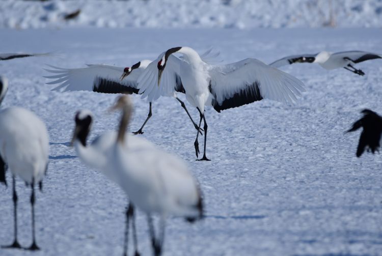 Las grullas salen más del agua en invierno, lo que aumenta las posibilidades de verlas. Hay varios lugares a los que van en masa para alimentarse durante el invierno. El más famoso es el santuario Tsurui-Ito.