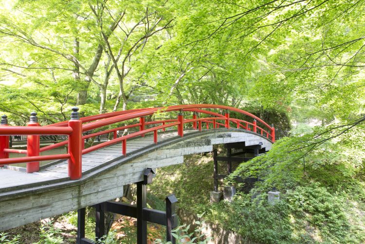 Uno de los mejores lugares del pueblo para hacer fotos es el puente rojo arqueado de Kajika, cuyas barandillas rojas contrastan vivamente con el verdor que lo rodea en verano, y se funden con el entorno en otoño.