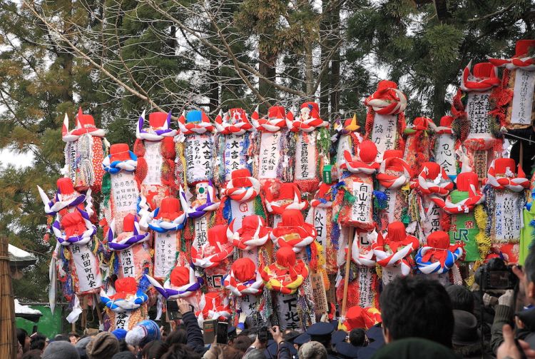 Se dice que los bonden, confeccionados con tela colorida, hacen de indicadores para los dioses que descienden al mundo. Después de dedicarlos al santuario, los bonden se colocan ordenadamente en los recintos, creando un bonito contraste entre los colores y los edificios cubiertos de nieve.
