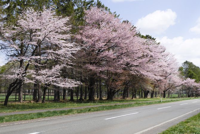 Caminar por el camino de Nijukken de Shizunai, rodeado de campos verdes y con la impresionante cordillera de Hidaka en la distancia, es la oportunidad perfecta para disfrutar de las vistas y los cerezos en flor.