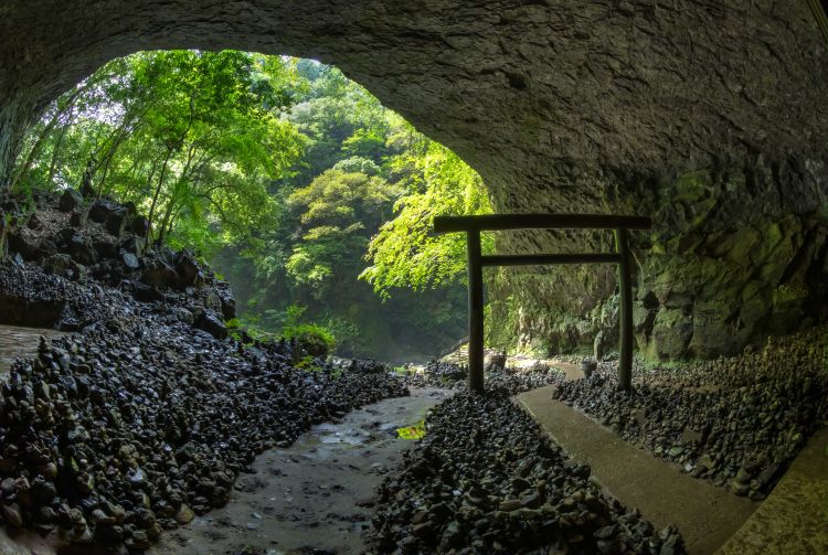 Situado en la zona de Takachiho , en la prefectura de Miyazaki de Kyushu , el santuario Amano Iwato-jinja está dedicado a la diosa del sol Amaterasu. Se le conoce, sobre todo, por los miles de pequeños montones de piedra que hay en el camino que recorre el río desde el santuario.