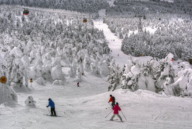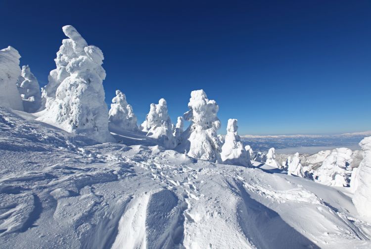 En la cima del monte Zao se pueden ver sorprendentes figuras de «monstruos de nieve» conocidas como juhyo, como resultado de una combinación de los vientos siberianos y las fuertes nevadas.