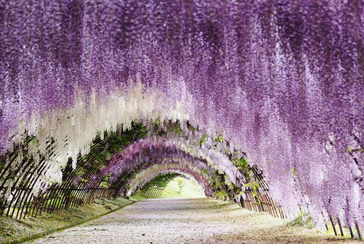 Podrás ver las glicinias que crecen en los dos túneles en el centro del parque, y cómo los árboles de glicinias se agrupan formando una enorme cúpula.