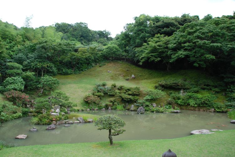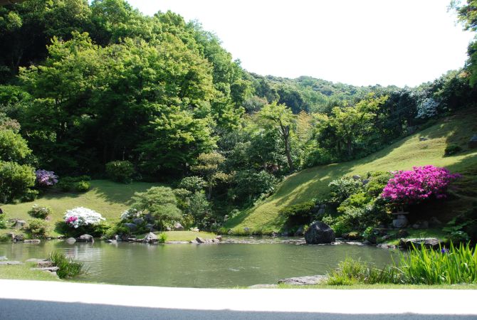 Desde la terraza del templo Kannonin, se puede contemplar el jardín de estilo japonés, eje central de este lugar sagrado. Un prado bien cuidado y pinos rodean el gran lago central, donde se alzan, en el centro, unas islas rocosas que representan una grulla y una tortuga.