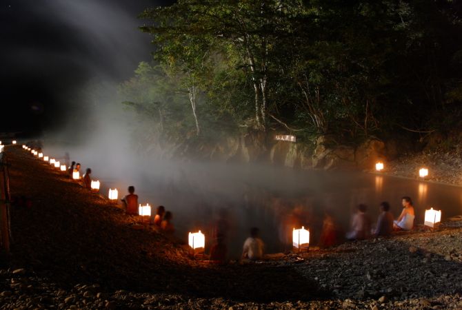 El atractivo misterio de esta zona está en su nombre, Kawayu Onsen, que significa río de aguas calientes. Las aguas termales borbotean por el cauce del río, por lo que te puedes dar un baño termal en un entorno natural. Tampoco te faltará tranquilidad, gracias a las posadas y hostales apiñados entre las frondosas y verdes laderas montañosas.