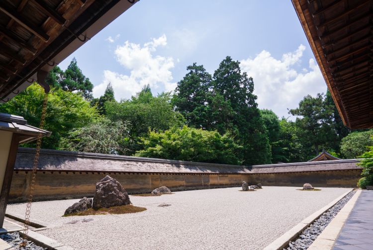 El jardín de rocas del templo Ryoanji puede parecer sencillo a primera vista, pero ha tenido un profundo efecto e influencia en los diseños de jardines de todo el mundo desde el siglo XIX. El jardín en sí consta de 15 piedras de distintos tamaños dispuestas en 250 metros cuadrados de arena blanca.