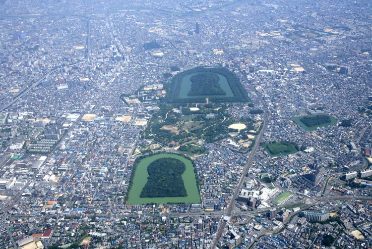 A principios del siglo V, el punto álgido de la época de los kofun, se construyeron las tumbas del emperador Nintoku, en Sakai, y el emperador Ojin (200-310), en Fujiidera. Al igual que otros túmulos funerarios, estas dos tumbas están ahora cubiertas de árboles y una densa vegetación. Además, algunas de ellas están rodeadas por fosos. Los constructores eligieron emplazamientos elevados para que los kofun tuvieran aún más protagonismo.