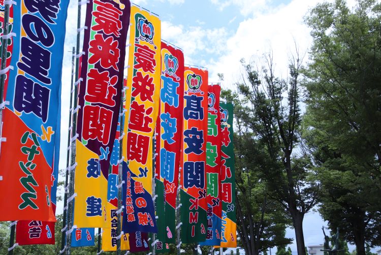 Des drapeaux colorés portant les noms des lutteurs de sumo