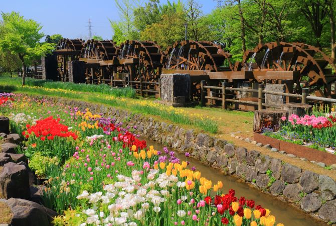 Les vastes champs de tulipes du parc sont soigneusement disposés en grandes rangées rouge, jaune et orange. Une fois entouré de toutes ces couleurs, la sensation peut être assez écrasante, comme si vous veniez d'entrer dans un tableau de van Gogh. Une petite rivière traverse le parc, et vous y trouverez également des roues à eau, des ponts et des sentiers pédestres.