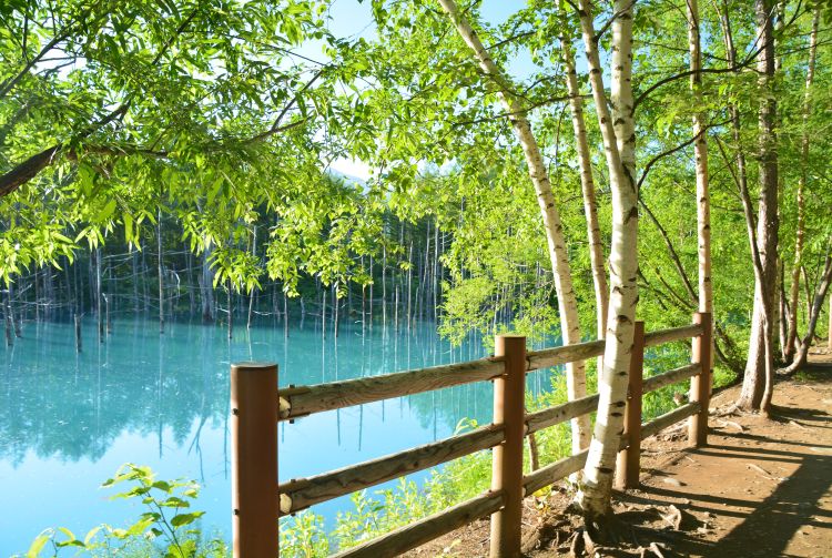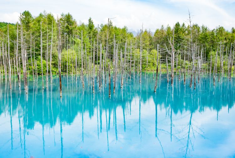 L'Étang Bleu est un heureux accident. Situé près de la ville de Biei , l'étang a été créé pour prévenir les dommages causés par les coulées de boue du mont Tokachi. Sa couleur varie du turquoise vif au vert émeraude, en passant par le bleu cobalt, en raison des impuretés présentes dans les eaux des chutes Shirahige. Les saisons, le vent, les nuages et la pluie sont autant de facteurs qui peuvent influer sur son aspect.