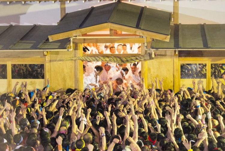 Un homme est choisi pour être le shin-otoko, et pendant les jours précédant le festival, il est maintenu dans la solitude et la prière. Enfin, il est rasé de la tête aux pieds et le jour du festival, il est envoyé nu dans la foule.À son arrivée, regardez le spectacle des milliers d'hommes à demi-nus qui jouent des pieds et des mains pour le toucher et lui transférer leurs malheurs futurs. Enfin, le dieu-homme est tiré jusque dans le bâtiment du temple, sous les acclamations de la foule.